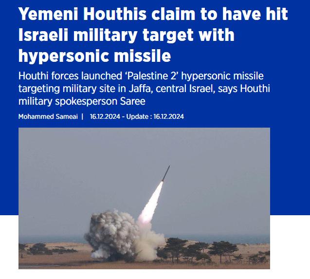 也门胡塞武装16日发表声明,称其发射“巴勒斯坦-2”型高超音速导弹,打击了位于以色列中部雅法地区的一处以色列军事设施。(图/土耳其阿纳多卢通讯社报道截图)