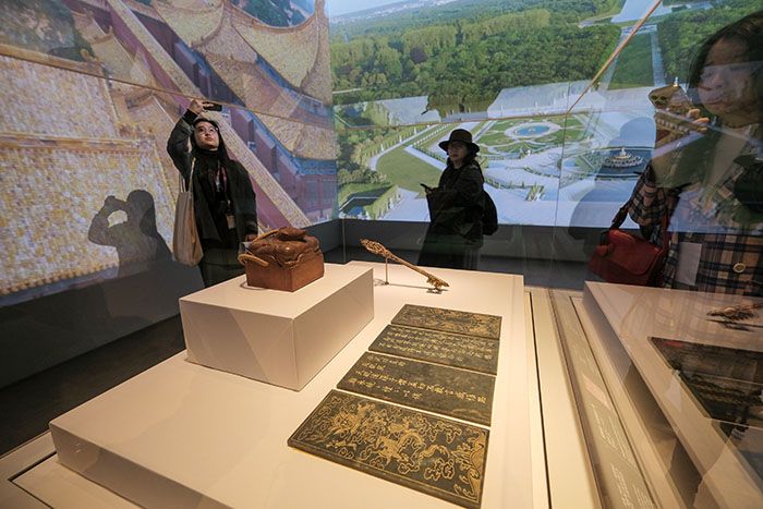 图为凡尔赛宫皇家礼拜堂大门钥匙、《十全记》玉册等展品。(图/ 中新社)