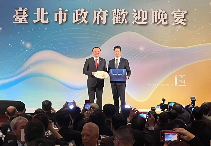 16日晚,台北市政府举办欢迎晚宴。上海市副市长华源(左)与台北市市长蒋万安(右)代表两市互赠礼品。(图/ 中新社)