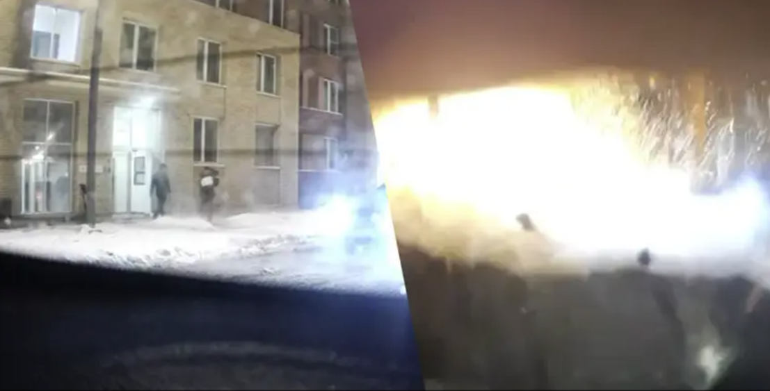 乌克兰独立新闻社曝光的视频画面显示,两人前后从一栋楼里出来,随后发生爆炸,现场出现强光。