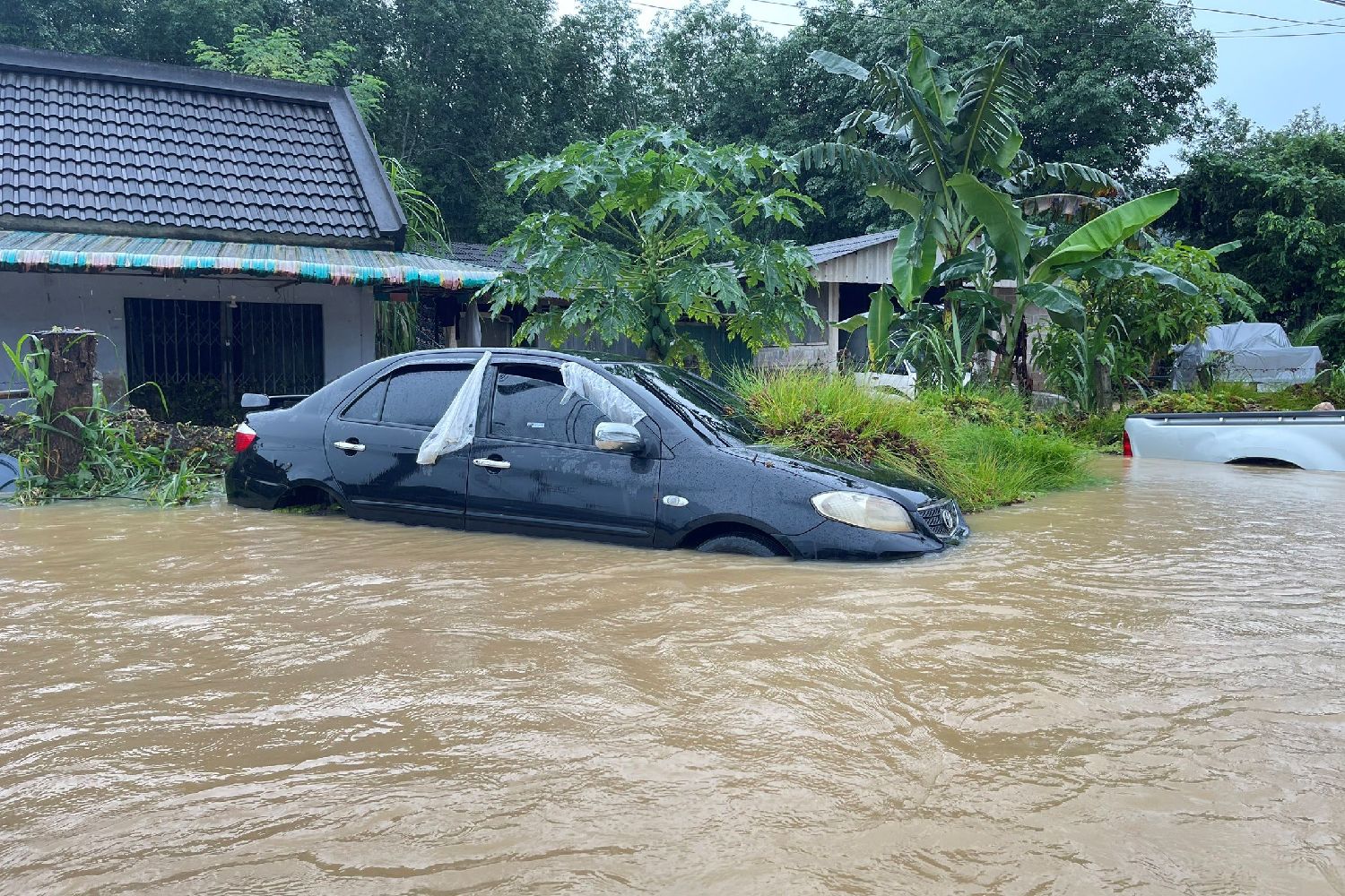 图为12月3日在泰国南部也拉府拍摄的被洪水浸泡的车辆。(图/新华社)