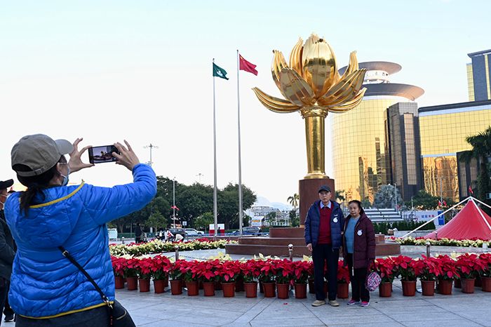 今年12月20日是澳门回归25周年纪念日。连日来,澳门各界举办各种庆祝活动;澳门的主要街道上,鲜艳的五星红旗和澳门特区区旗迎风飘扬,街头随处可见各类庆祝标语,喜庆“氛围感拉满”。