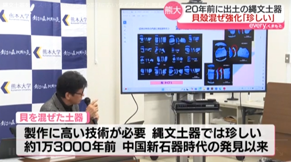 熊本大学的一个研究小组近日经调查发现,约20年前出土的一批绳文时代陶器十分罕见。(图/熊本县民电视台视频截图)
