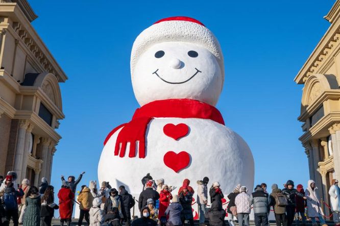 12月17日,游客在哈尔滨松花江畔的大雪人前游览。(图/新华社)