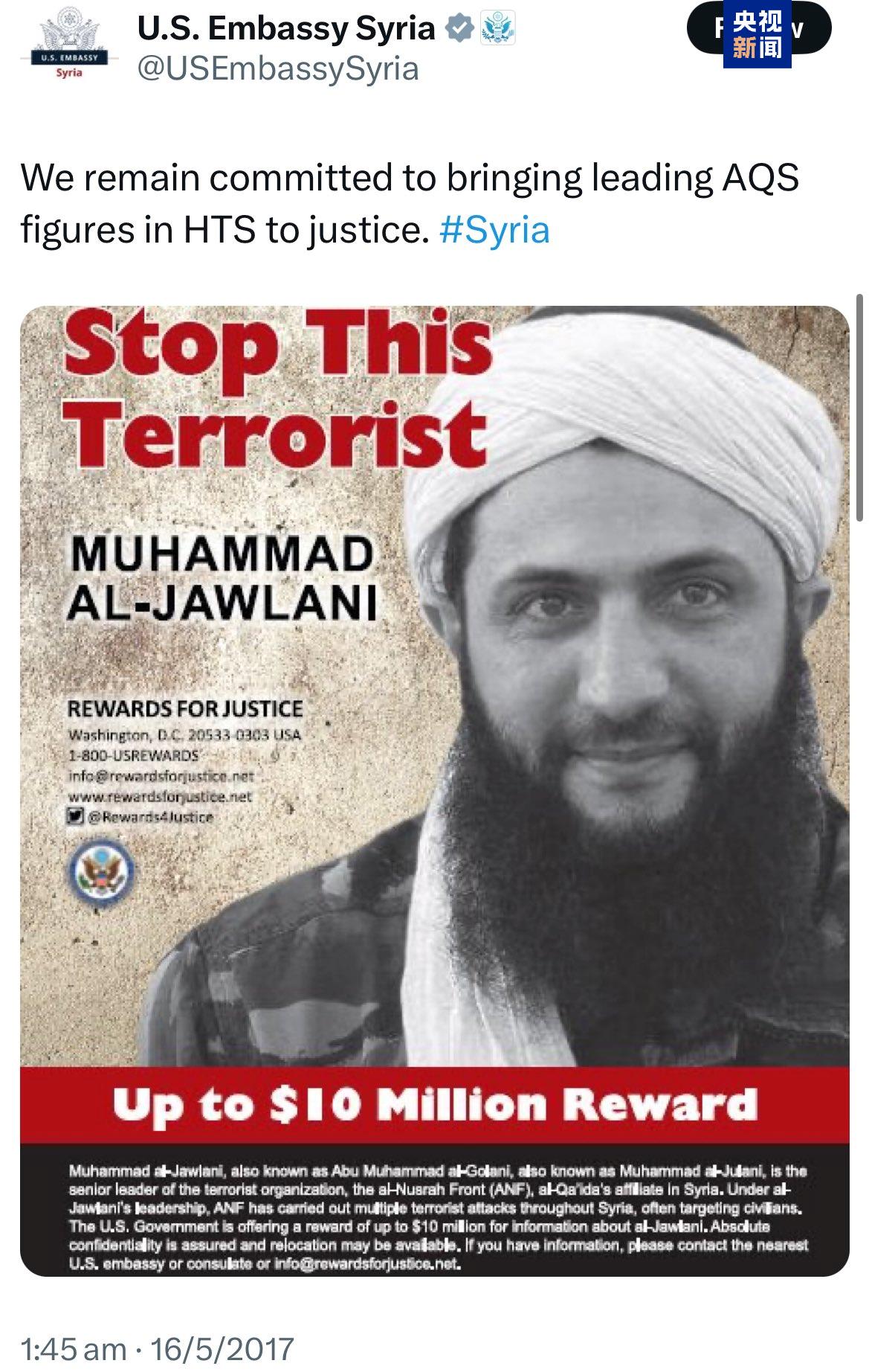 △2017年5月16日美国驻叙利亚大使馆:我们致力于将这名“沙姆解放组织”中的基地组织叙利亚分支头目绳之以法。
