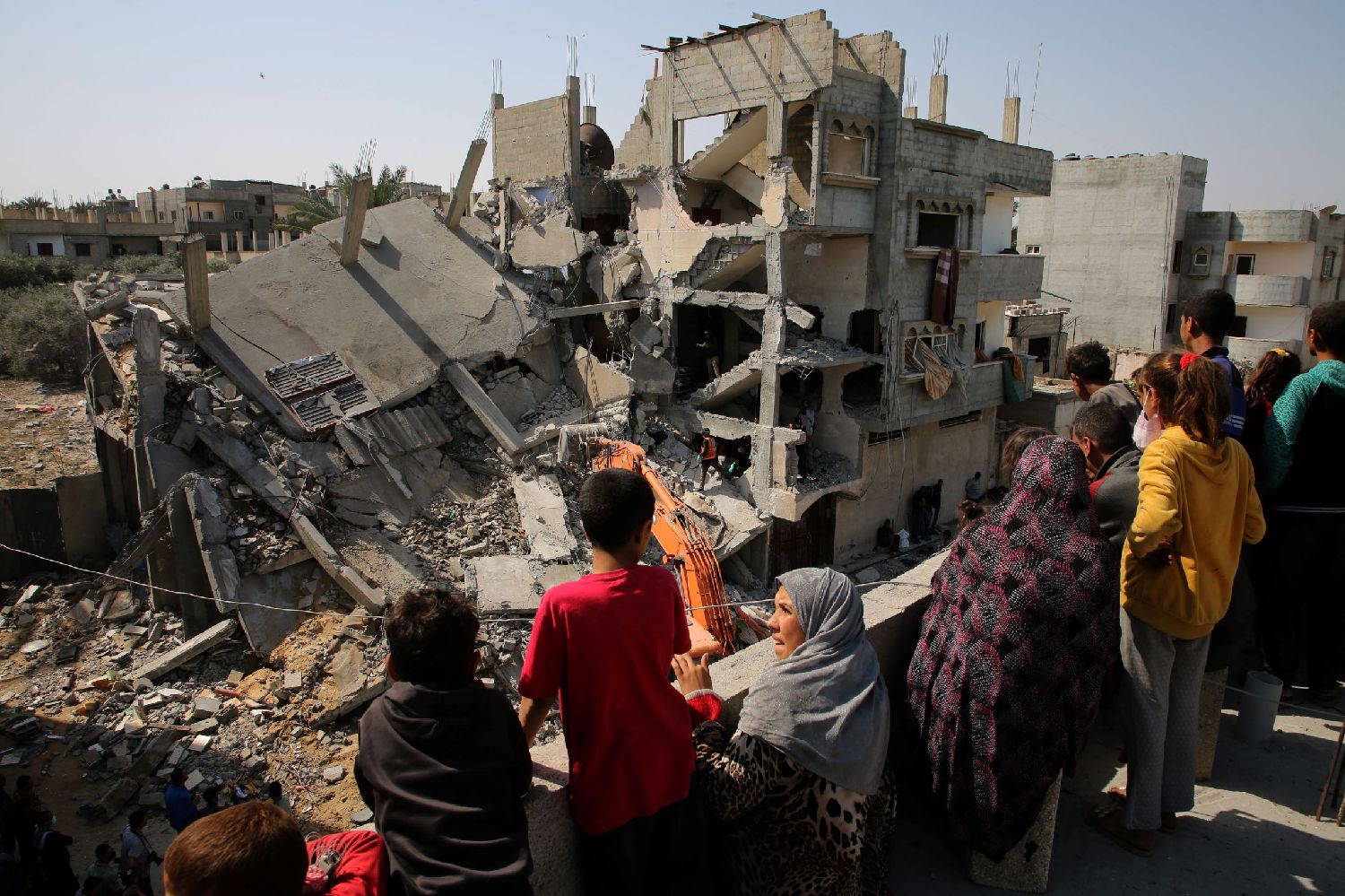 图为在加沙地带南部城市拉法,人们查看被以军空袭后的建筑。(图/新华社)