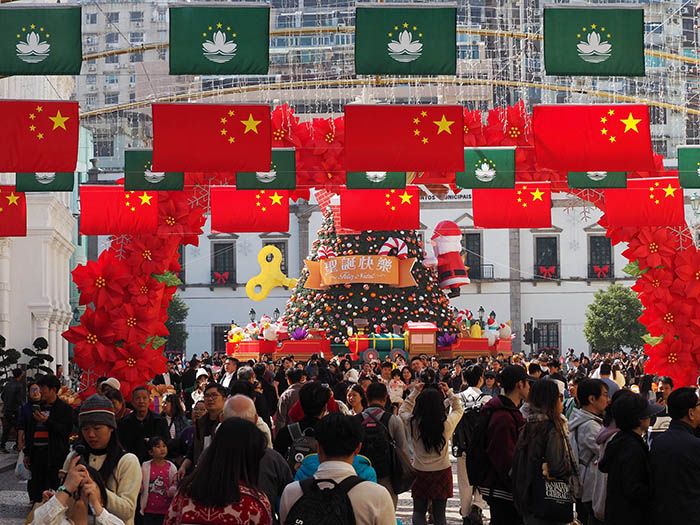 21日,大批游客在澳门各个景区观光游览,整个澳门城区热闹腾腾。(图/ 香港中通社)
