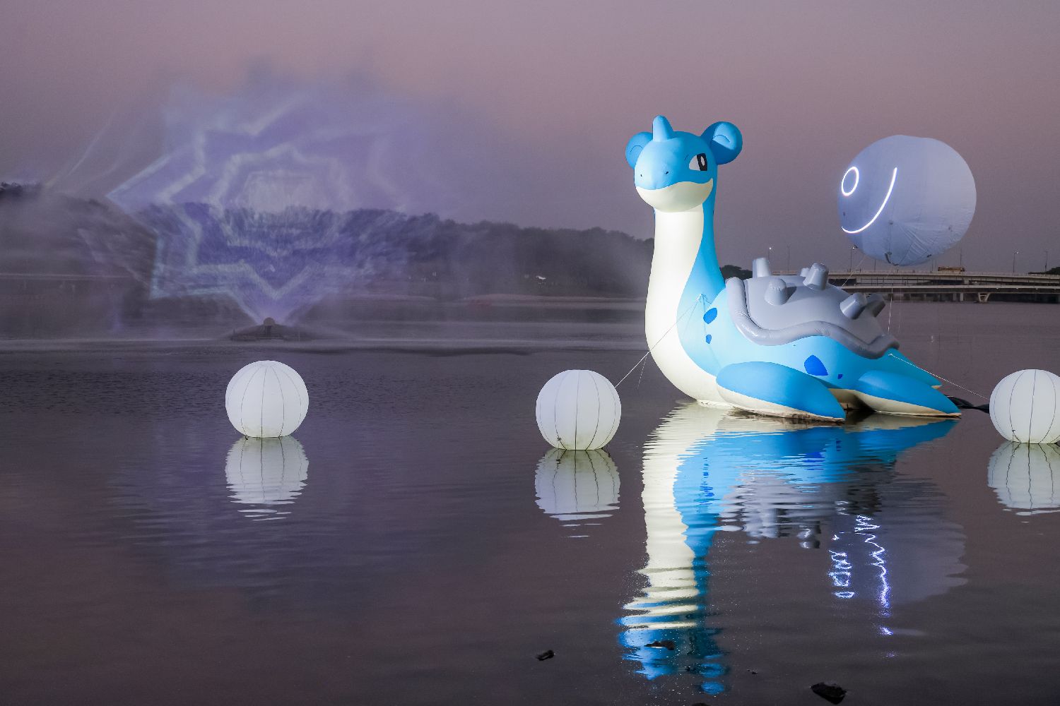 冲浪选手拉普拉斯,来到深圳依然离不开水。喜欢在海上前行的它,最终选择在人才公园湖中降落。这次,拉普拉斯还带来了表演节目,在每晚6点的亮灯仪式,配合40米宽梦幻水幕秀,点亮梦想之境。图为巨型拉普拉斯气模亮相。(Pokemon宝可梦官方微博)