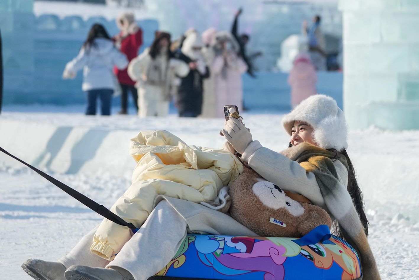 12月21日,游客在哈尔滨冰雪大世界园区游玩、拍照。(新华社)