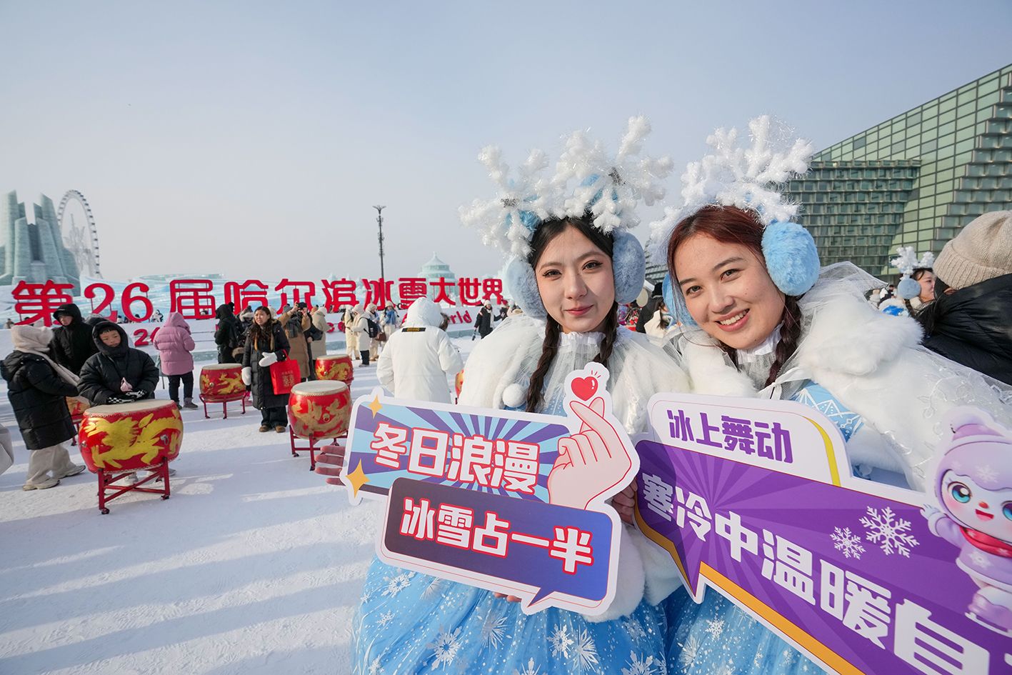 12月21日,演员在哈尔滨冰雪大世界园区欢迎游客。(新华社)