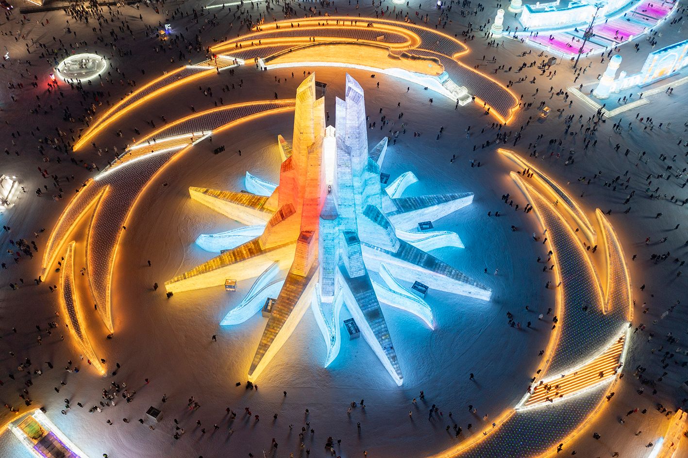 这是12月21日拍摄的哈尔滨冰雪大世界主塔“亚洲同心”(无人机照片)。(新华社)