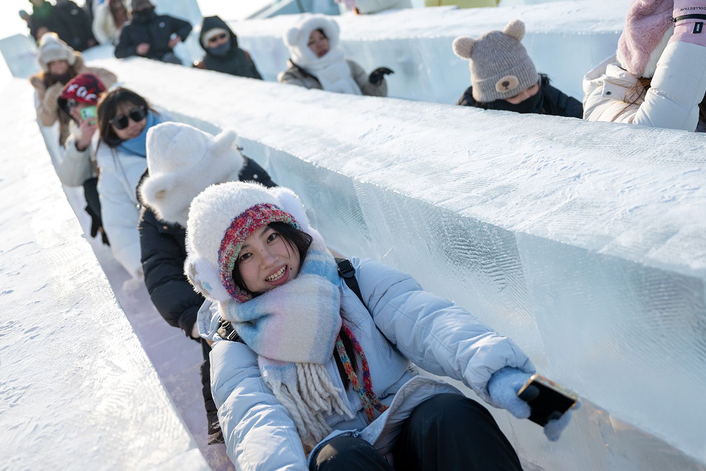 12月21日,游客在哈尔滨冰雪大世界园区内玩滑梯。(新华社)