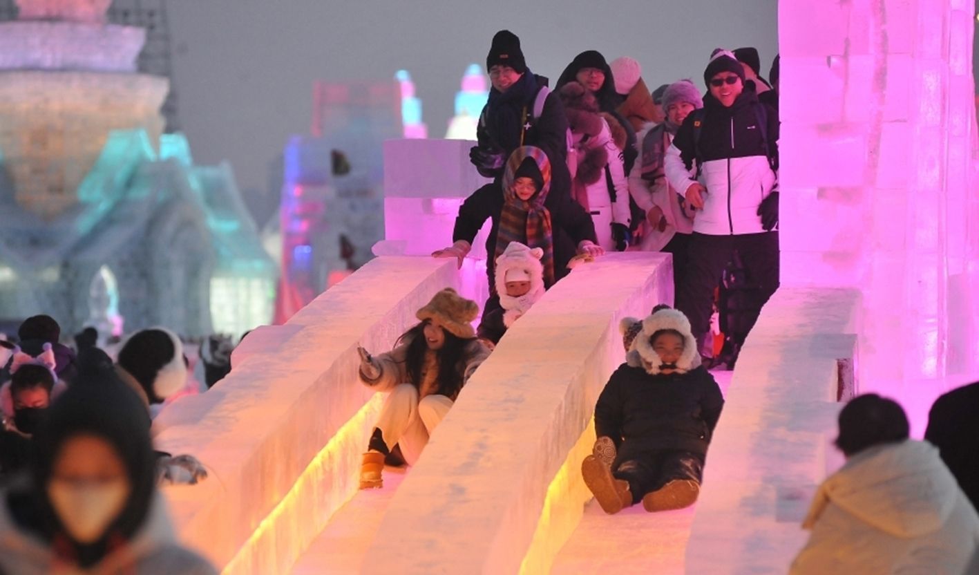 图为游客在哈尔滨冰雪大世界园区内玩滑梯。(中新社)