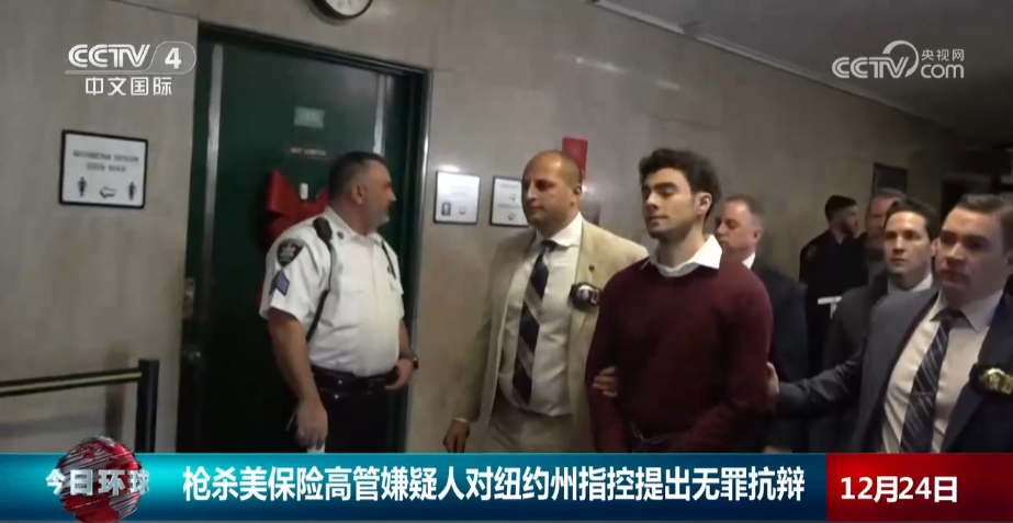 美国联合健康集团高管枪杀案的嫌疑人路易吉·曼吉奥内23日在纽约出庭,对一级谋杀等11项州级指控表示不认罪。(图/中国央视新闻视频截图)