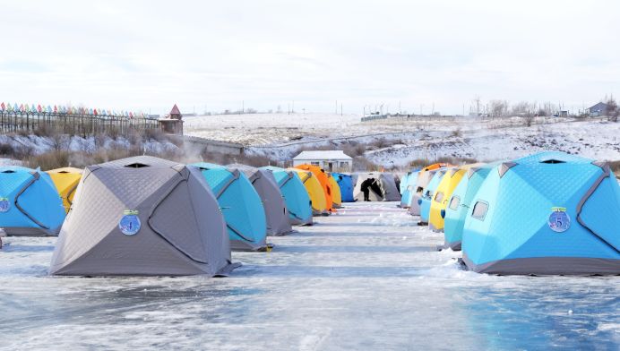 61个冰钓帐篷整齐地立于中俄界河冰面上,80名中俄参赛选手开冰凿洞、抛竿垂钓,将在5个小时内一较高下。