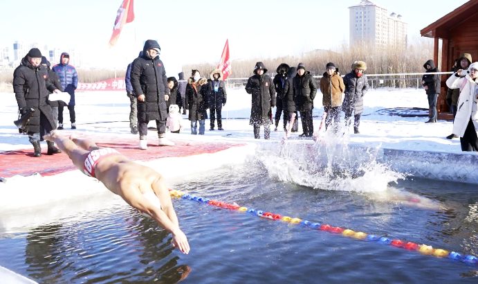 12月21日,内蒙古呼伦贝尔,中俄蒙国际冬泳挑战赛在伊敏河上的冬泳基地开赛。(图/中新社)