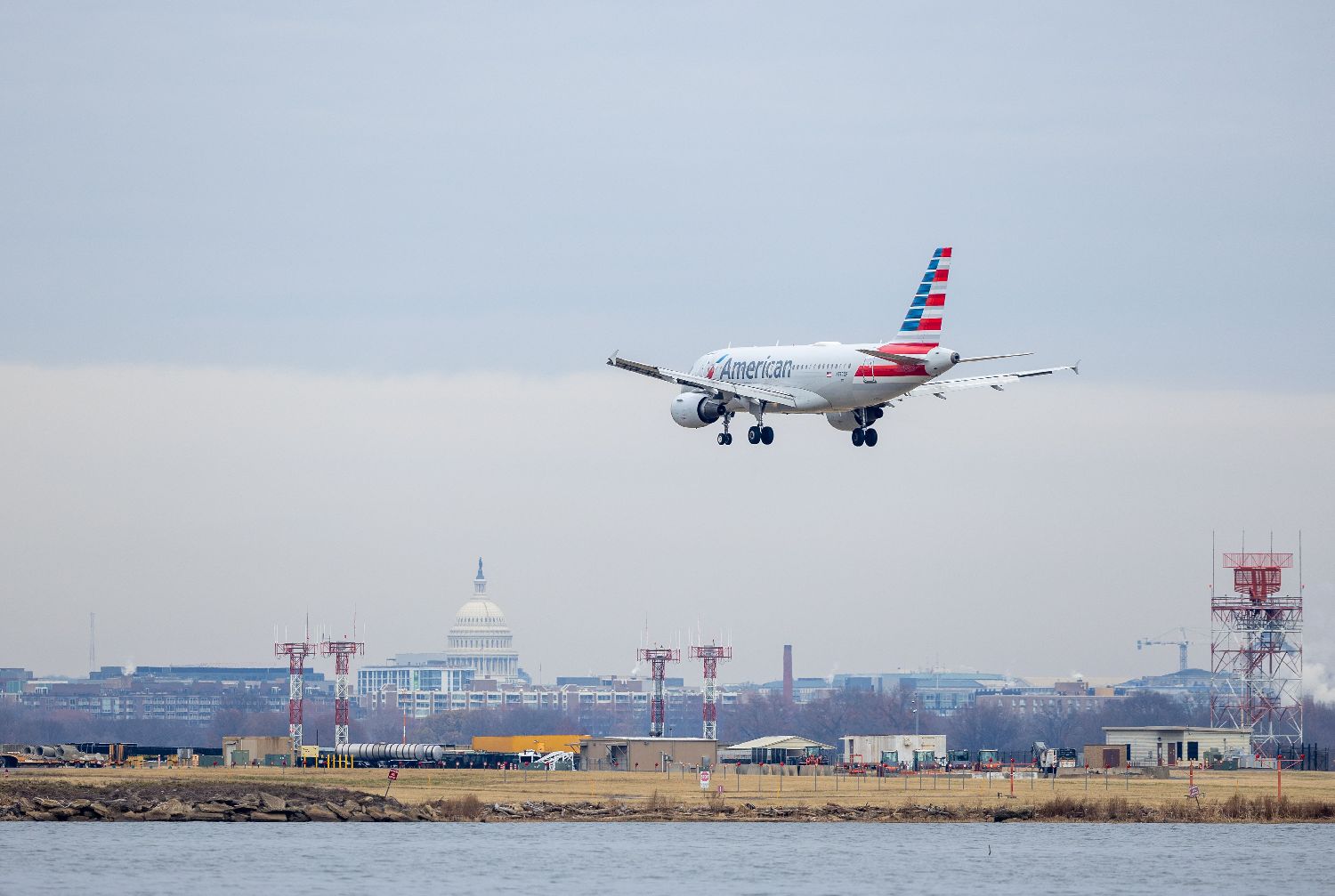 图为12月24日,一架美国航空公司飞机降落美国弗吉尼亚州阿灵顿的里根国家机场。(图/新华社)