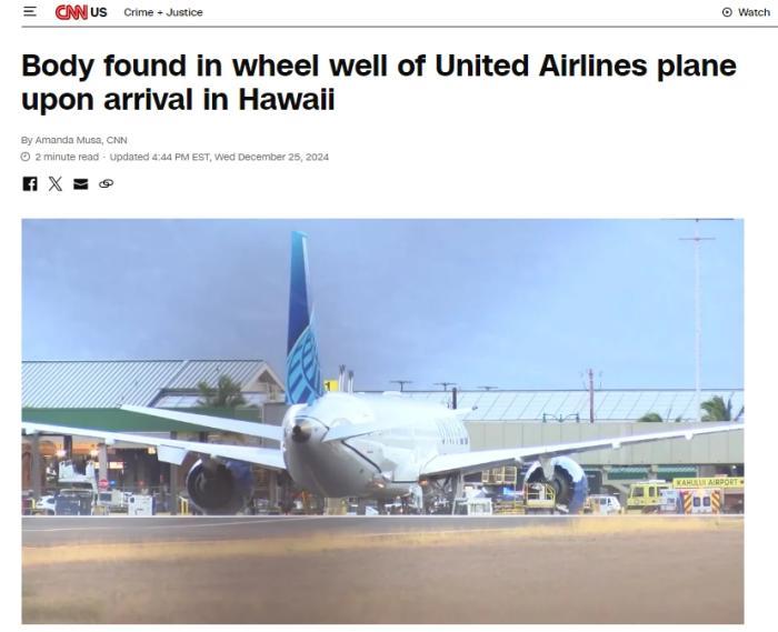 美国联合航空公司25日发布声明称,24日从芝加哥出发的美联航202航班抵达夏威夷的毛伊岛后,在飞机主起落架的轮舱内发现一具尸体。(图/美国有线电视新闻网报道截图)