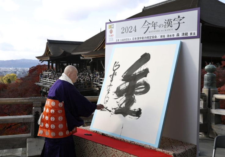 12月12日,在日本京都,清水寺住持森清范用毛笔书写日本2024年度汉字“金”字。(图/新华社)