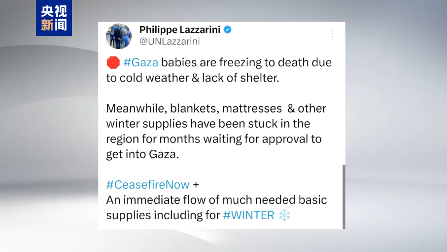 联合国近东巴勒斯坦难民救济和工程处主任专员拉扎里尼27日在社交媒体发文称,由于天气寒冷且缺少避难场所,巴勒斯坦加沙地带的婴儿正在被冻死。与此同时,毯子、床垫等冬季物资已在加沙地带外滞留了数月,仍没有得到进入的许可。拉扎里尼呼吁立即实现加沙地带停火,并向加沙地带提供各种急需的基本物资。