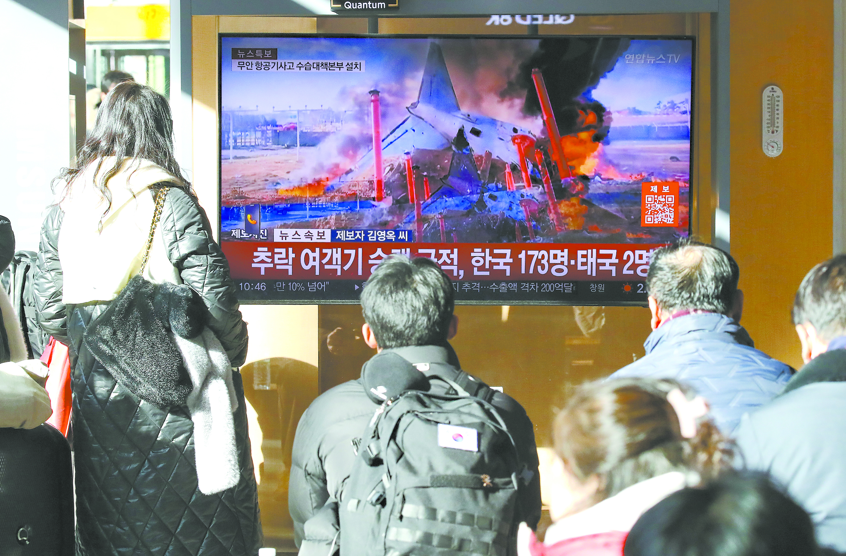 12月29日,一架载有181人的飞机在韩国务安国际机场坠毁。图为韩国民众在位于首尔的车站关注坠机事件的新闻报道。(视觉中国)