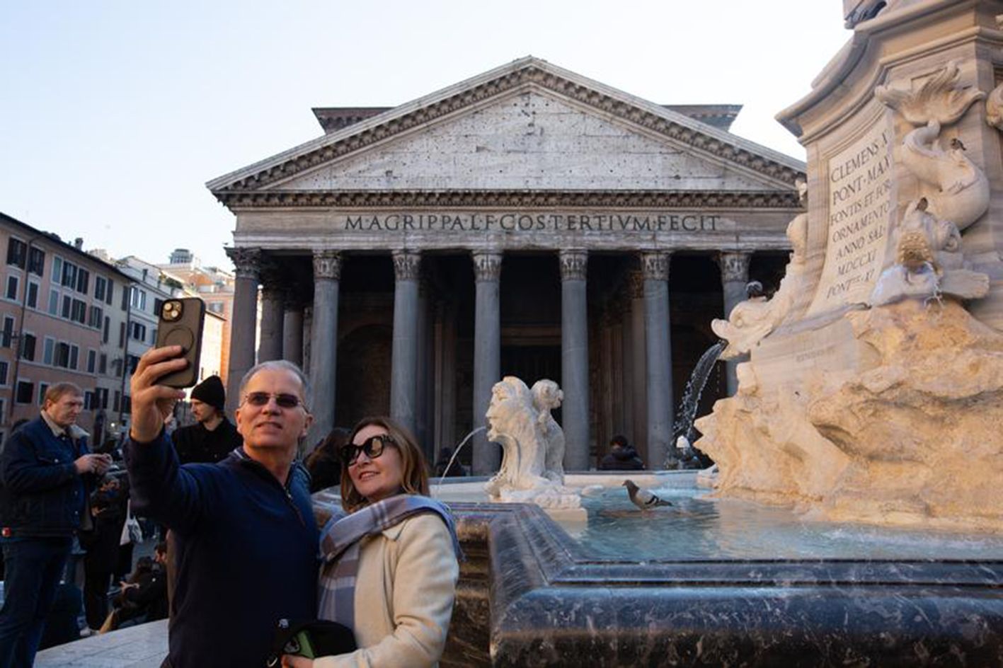 12月30日,人们在意大利罗马参观翻新后的万神殿喷泉。新年临近,意大利罗马多处知名建筑、景点持续数月的修缮翻新工程结束,陆续对游客开放。(新华社)