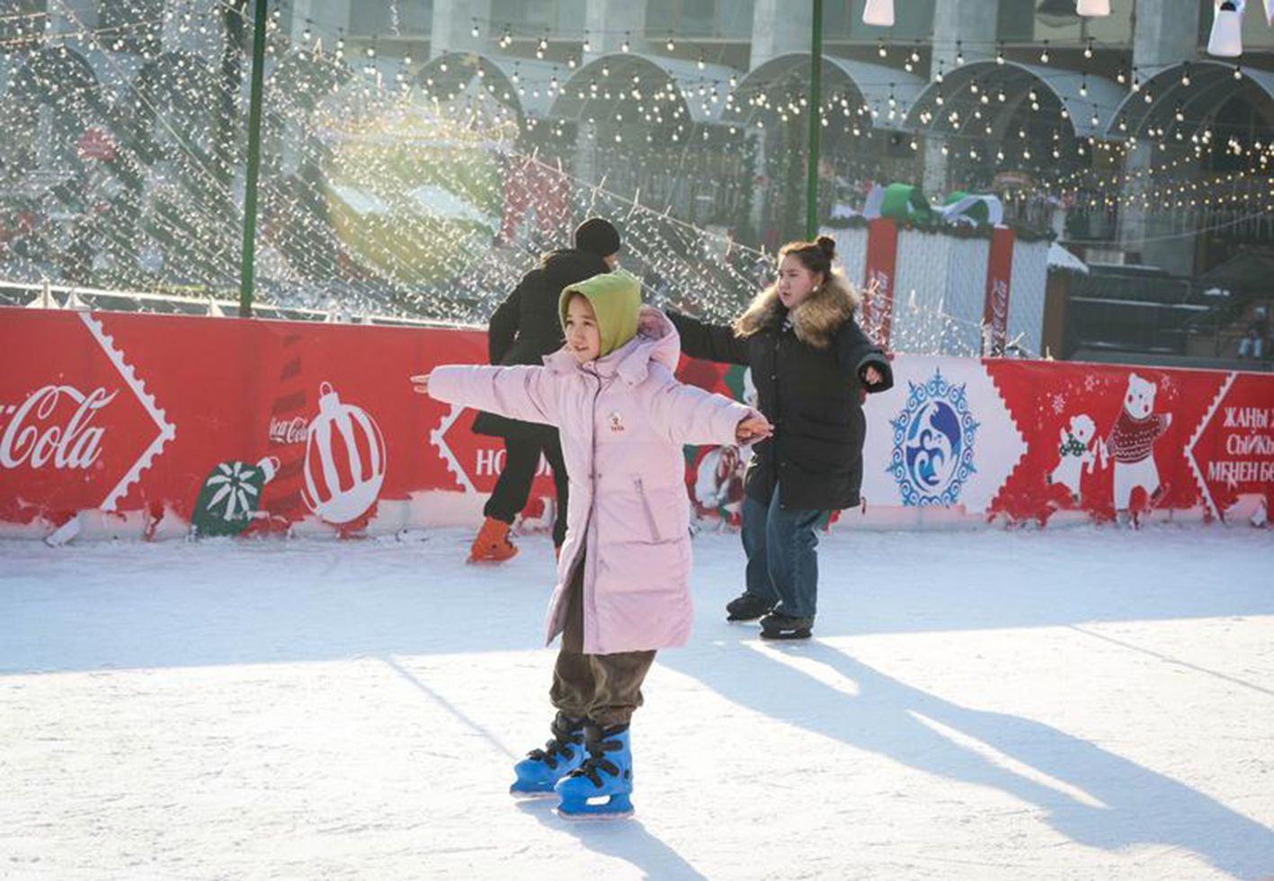 12月25日,在吉尔吉斯斯坦首都比什凯克的阿拉套广场,人们在迎接新年活动上滑冰。(新华社)