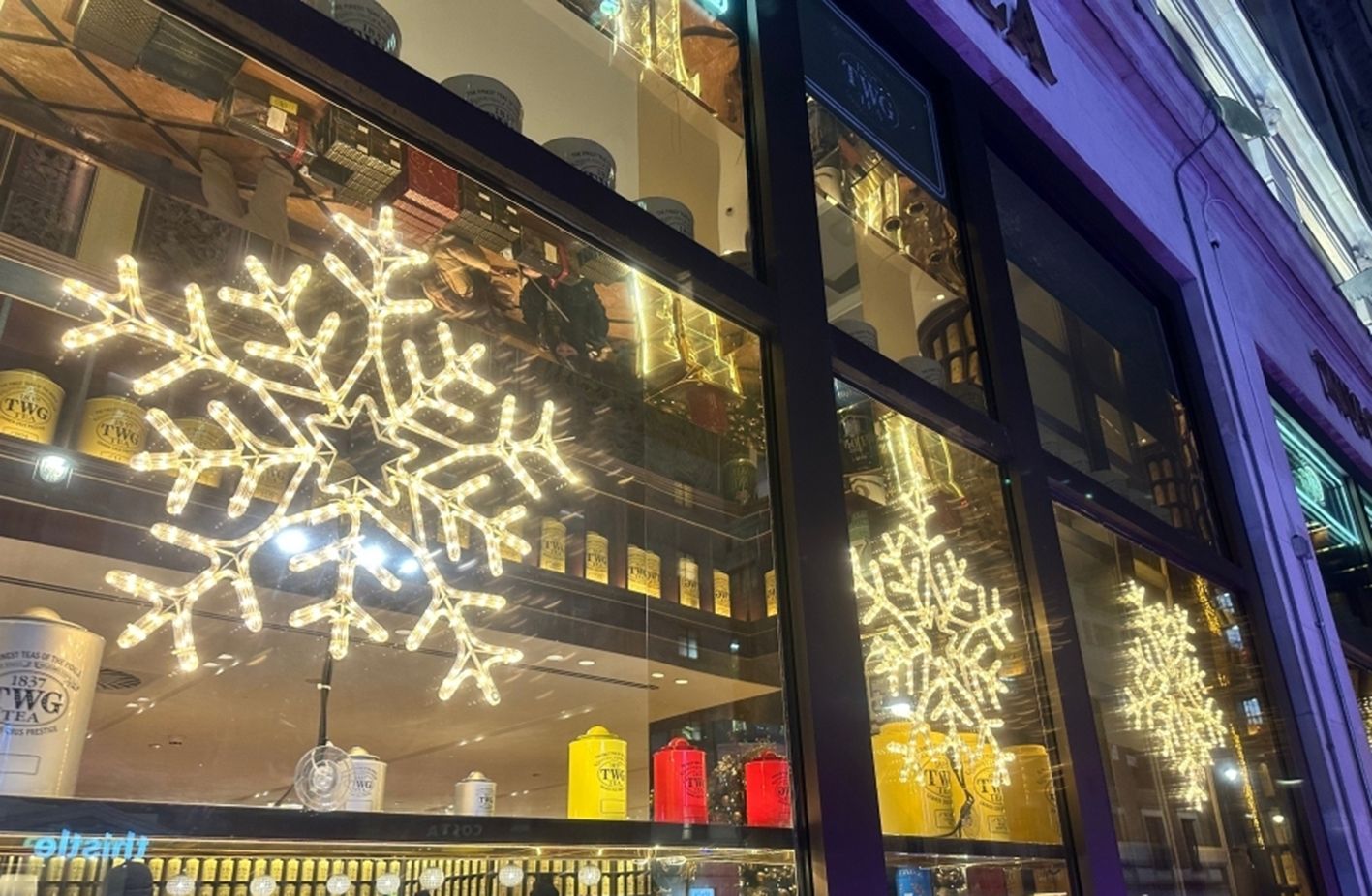 当地时间12月27日晚,英国伦敦市中心皮卡迪利广场附近街道亮起多彩灯饰,迎接新年。(中新社)