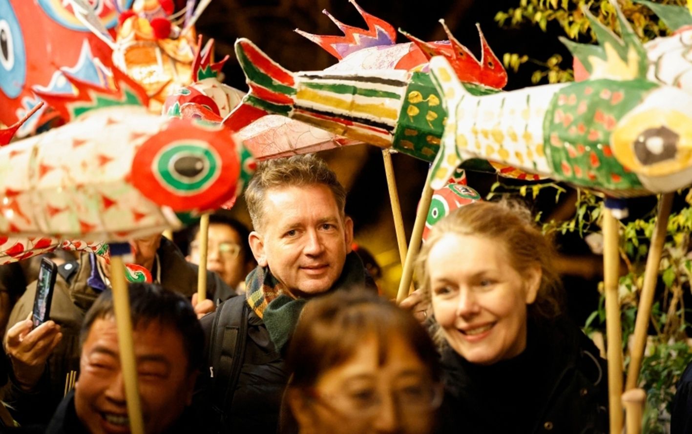 12月26日晚,来自荷兰羊角村的村民体验鱼灯巡游。当日,鱼灯夜游会在安徽省黄山市徽州区西溪南古村落上演,来自荷兰羊角村的村民和游客一同舞动鱼灯巡游古村落,感受中国年俗氛围。(中新社)