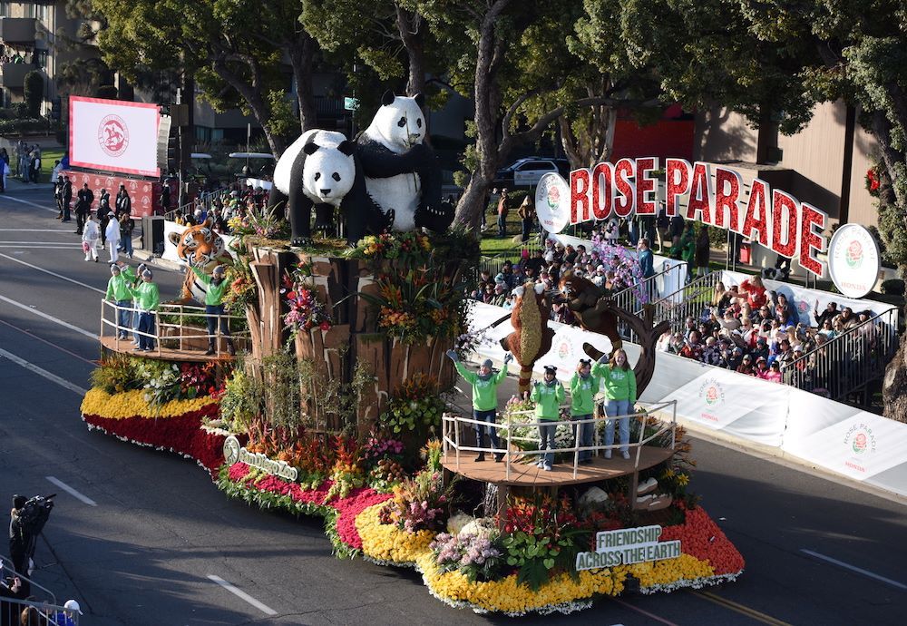 1月1日,第136届玫瑰花车游行在美国加利福尼亚州历史文化名城帕萨迪纳市举行。图为美国圣迭戈动物园“大熊猫”花车。(图/中新社)