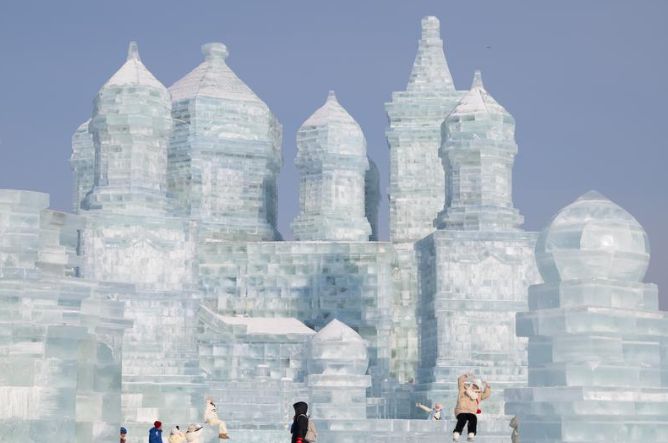 图为游客在哈尔滨冰雪大世界园区游玩。(图/新华社)