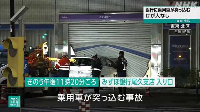 事故发生在2日晚上11时20分左右,地点是东京北区瑞穗银行尾久支店的入口。根据东京警视厅的说法,这辆乘用车是从JR西日暮里站方向驶向田端新町一丁目交叉口时,与从左侧驶来的另一辆车发生了碰撞,随后失控撞入了银行的门店。当时银行已经关闭,警方表示,包括乘用车司机在内,事故中没有人员受伤。