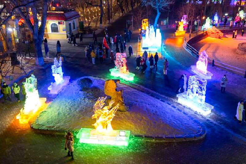 图为1月2日,黑龙江省哈尔滨市兆麟公园,游客在冰灯艺术游园会园区内观赏冰灯(无人机照片)。(新华社)