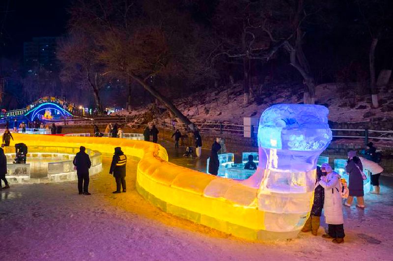 图为1月2日,黑龙江省哈尔滨市兆麟公园,游客在冰灯艺术游园会园区内一处蛇形冰雕附近游玩。(新华社)