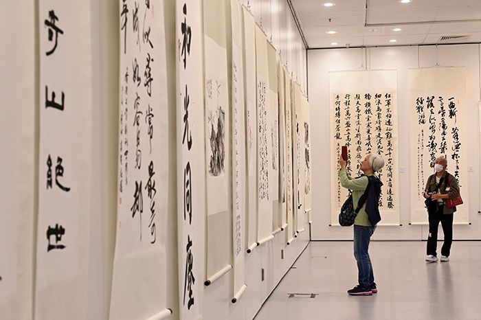 图为参观者在书画作品前驻足拍摄。(图/中新社)