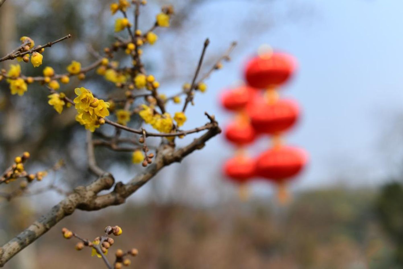 1月5日,在江苏无锡梅园,绽放的腊梅与大红灯笼相映成景。(新华社)