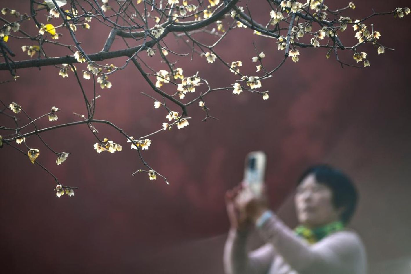 1月5日,游客在河南省济源市济渎庙拍摄腊梅。(新华社)