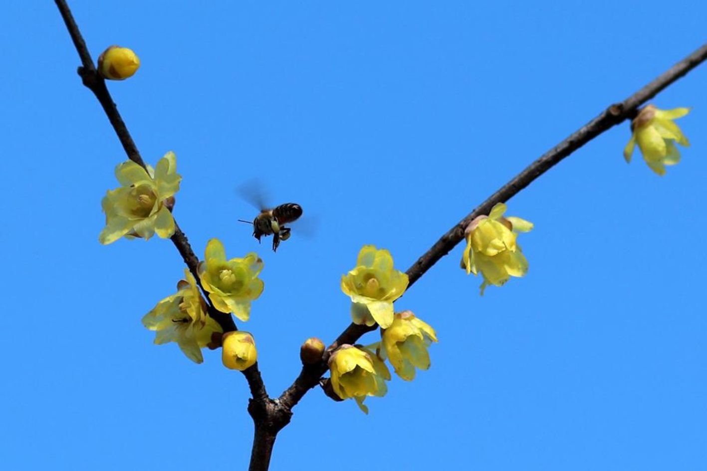 1月5日,在贵州省黔南布依族苗族自治州都匀市南沙洲公园,蜜蜂在腊梅花间飞舞。(新华社)