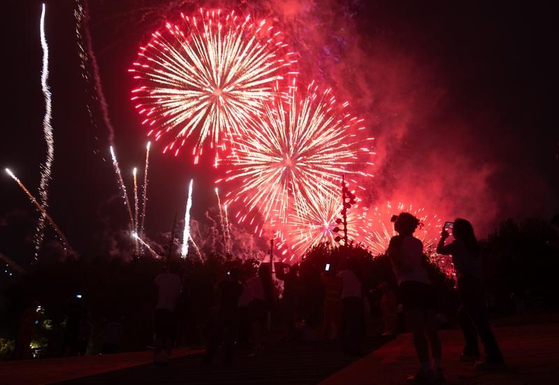 9月14日,在湖北省武汉市南岸嘴江滩公园,市民在观赏烟花。(图/新华社)