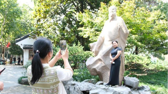 2024年10月9日,游客在西湖边与苏轼雕塑合影。(图/中新网)