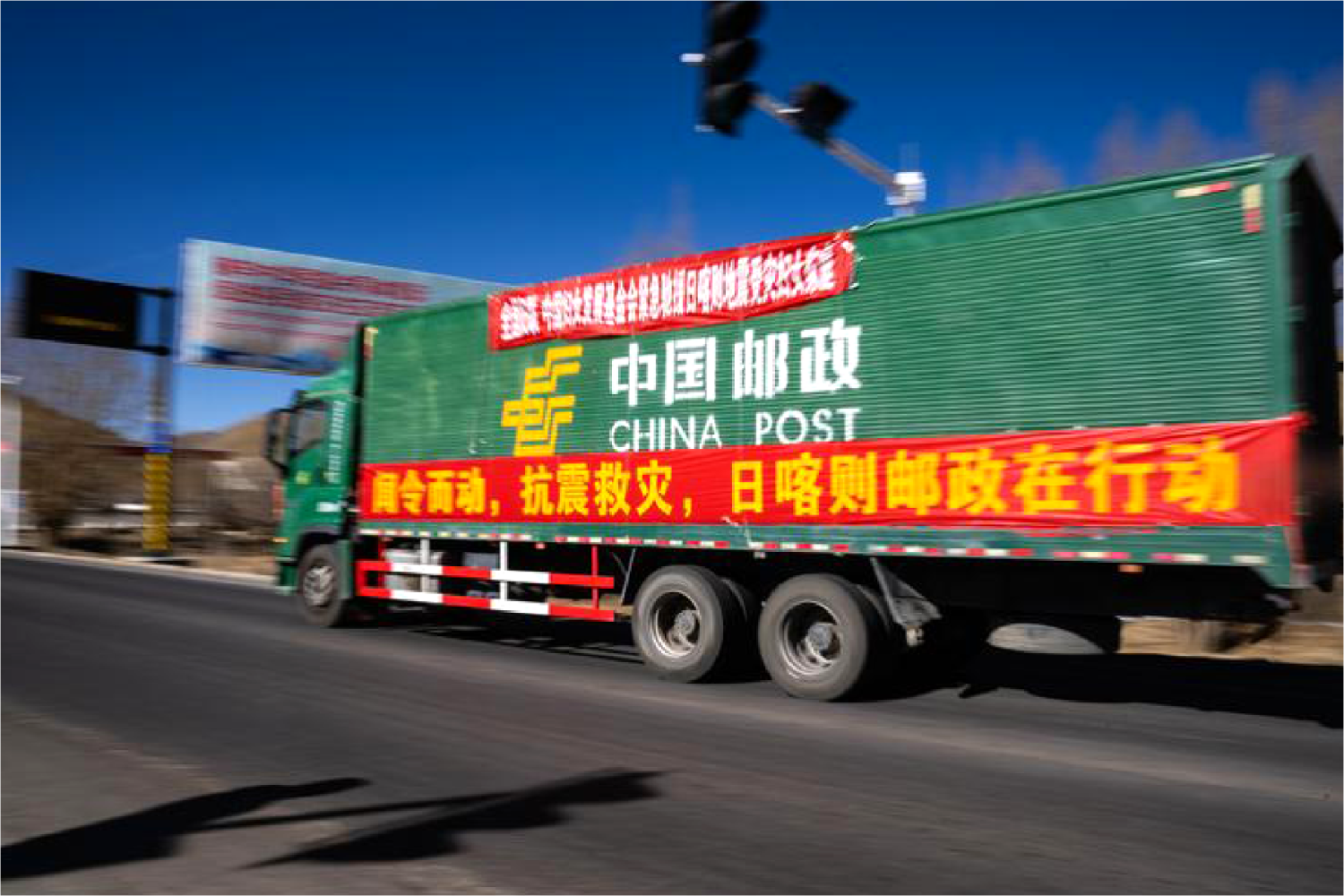 图为1月8日,在日喀则市境内的318国道,中国邮政的抗震救灾运输车辆向灾区方向驶去。(新华社)