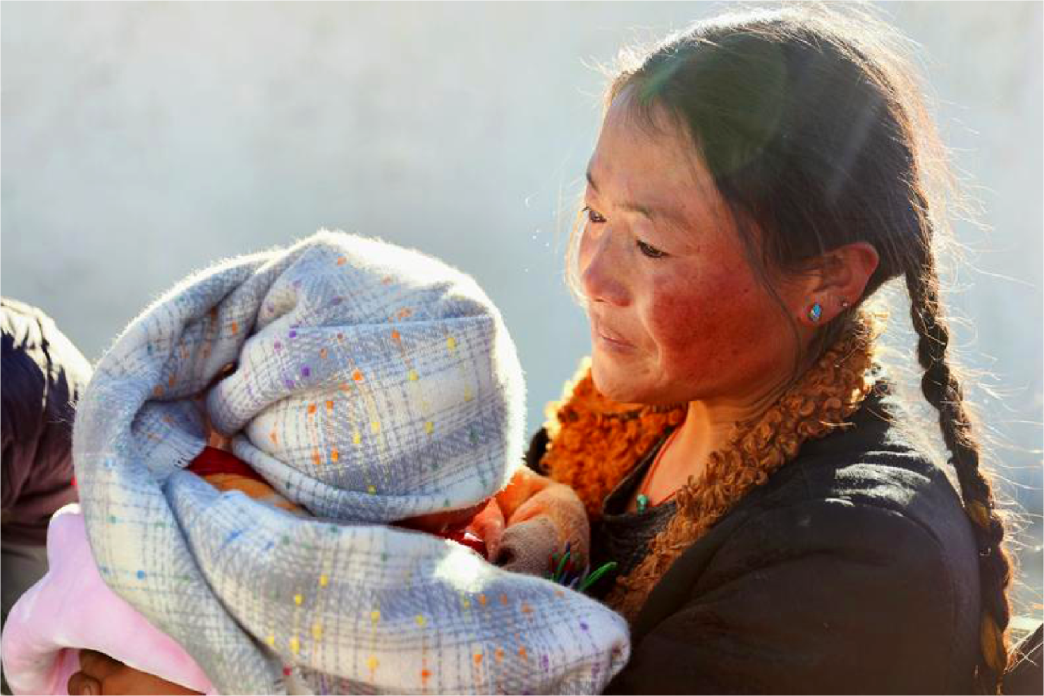 图为1月8日,定日县长所乡通来村的受灾民众措姆抱着自己的孩子在领取志愿者送来的御寒衣物。(新华社)