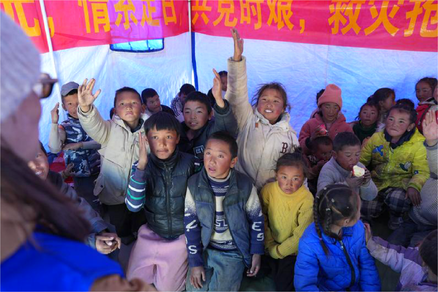图为1月8日,在日喀则市定日县措果乡塘仁村地震灾后安置点,孩子们在回答西藏星光社会工作服务中心社工关于地震灾害及灾后心理建设的问题。(新华社)