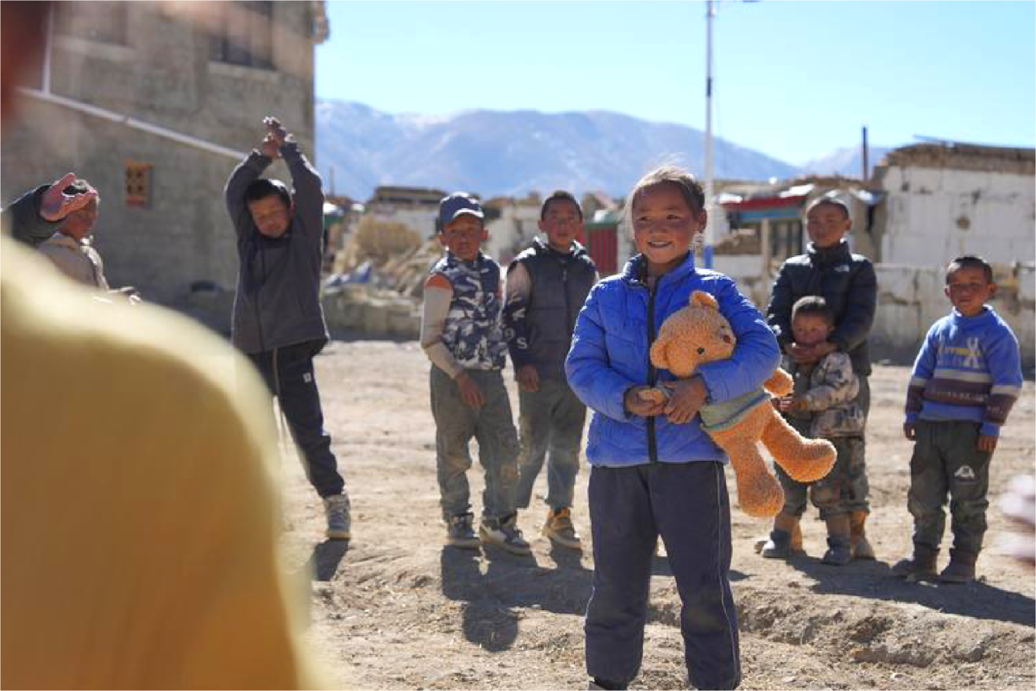 图为1月8日,在日喀则市定日县措果乡塘仁村地震灾后安置点,西藏星光社会工作服务中心社工向孩子们赠送玩偶熊,并给他们表演节目。(新华社)