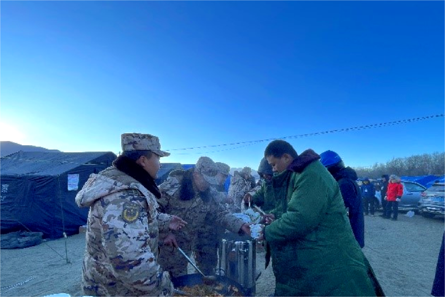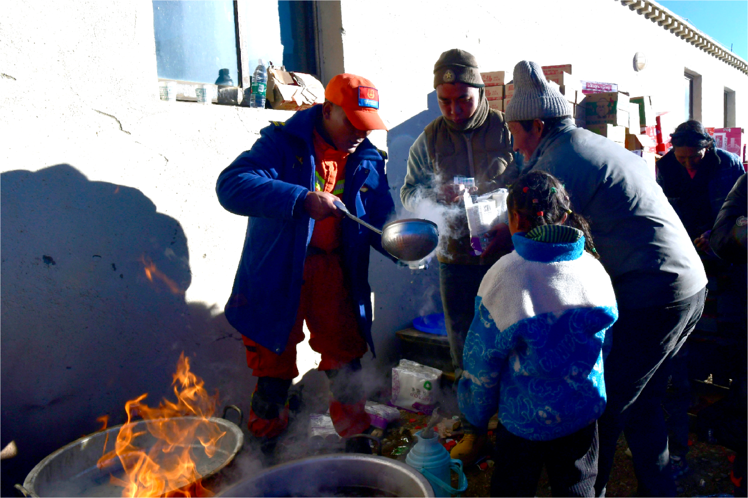 图为1月8日,在措果乡野江村安置点,西藏森林消防总队日喀则大队为民众熬制甜茶、分发早餐。(中新社)