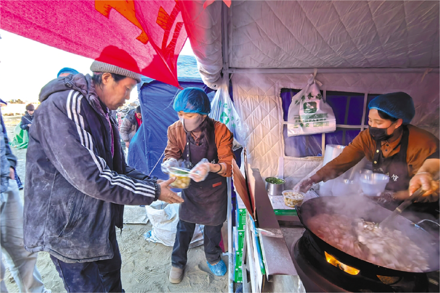 图为爱心企业员工为灾区民众送上热气腾腾的面片。(中国西藏新闻网)