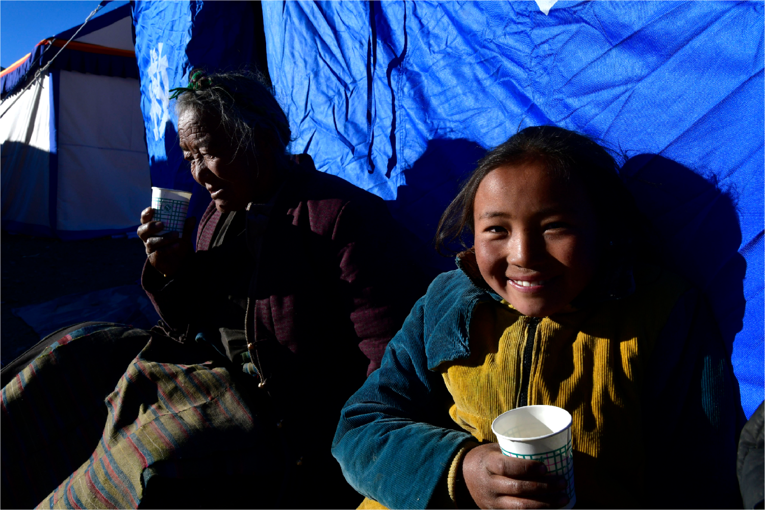 图为1月8日,在措果乡野江村安置点,民众在帐篷前喝甜茶。(中新社)