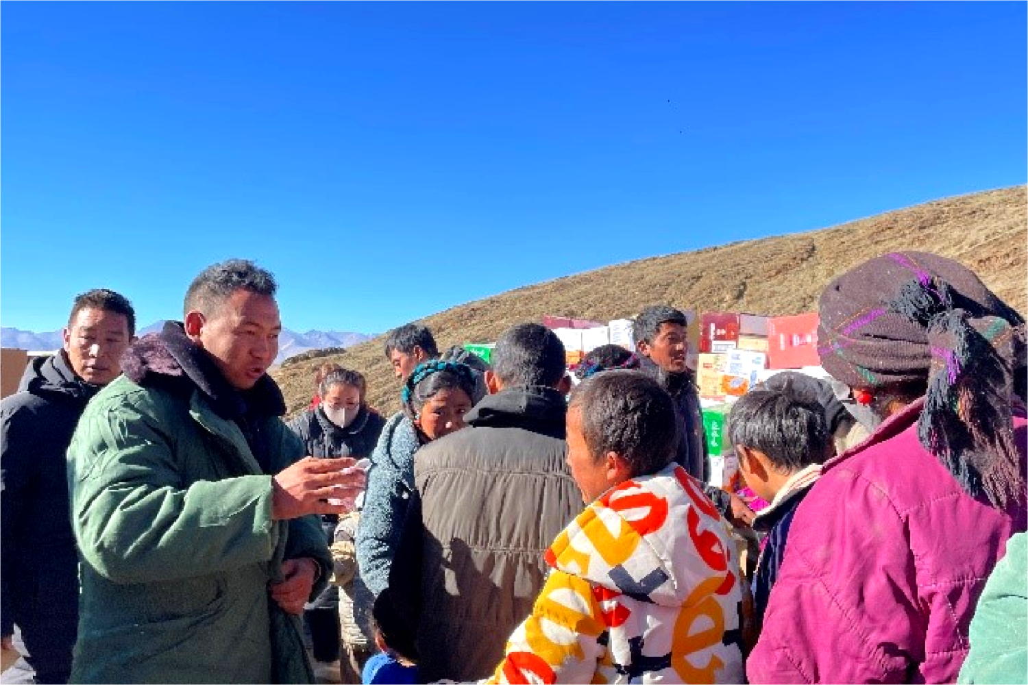 图为1月8日,定日县公安局干警顿珠次仁(左二)正在协助分发物资。(人民网)
