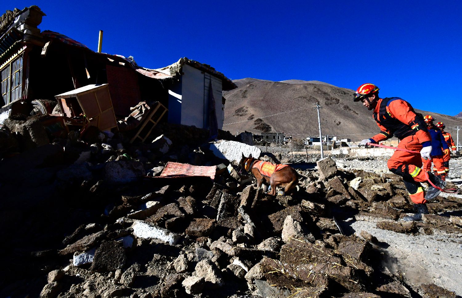 1月8日,西藏自治区消防救援总队拉萨重型地震救援队消防指战员携搜救犬在野江村进行搜救排查。(图/中新社)