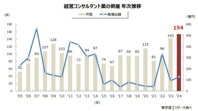※本调查基于日本产业分类(细分类)中的“经营咨询行业”,统计分析了从2005年至2024年的破产数据。